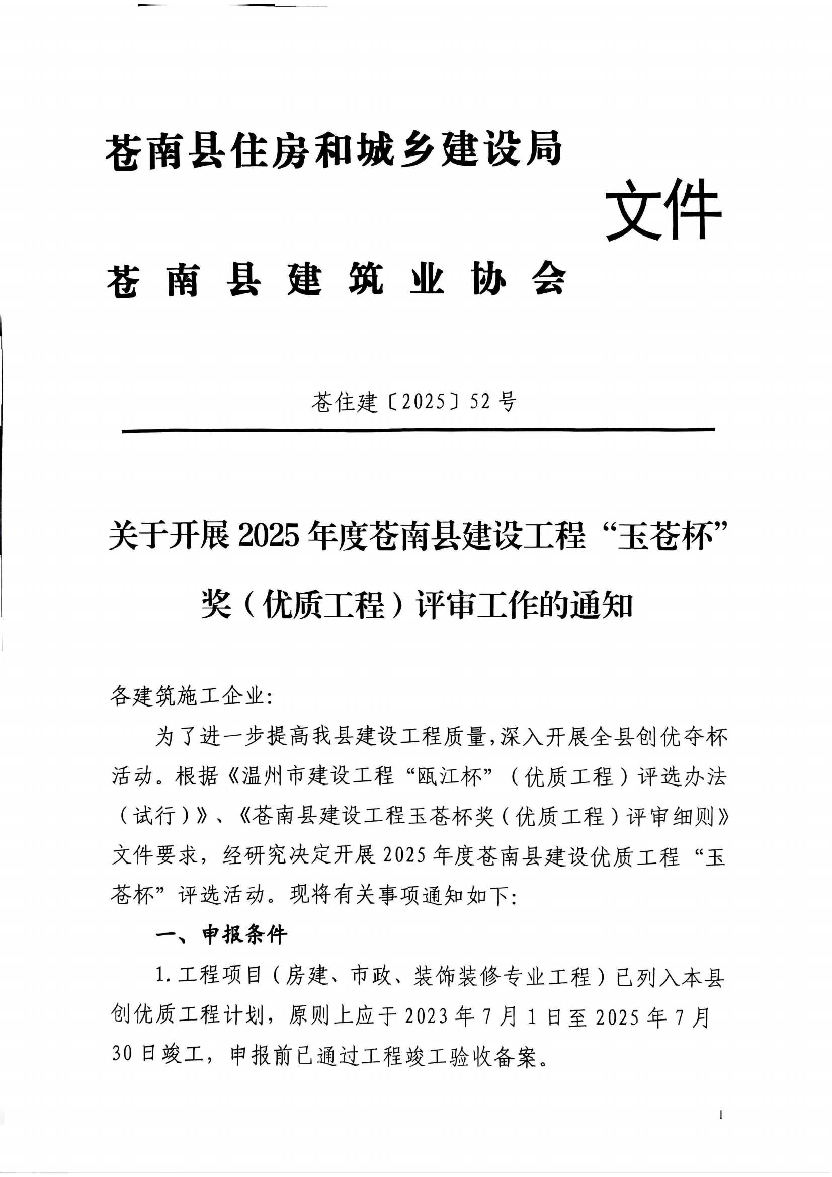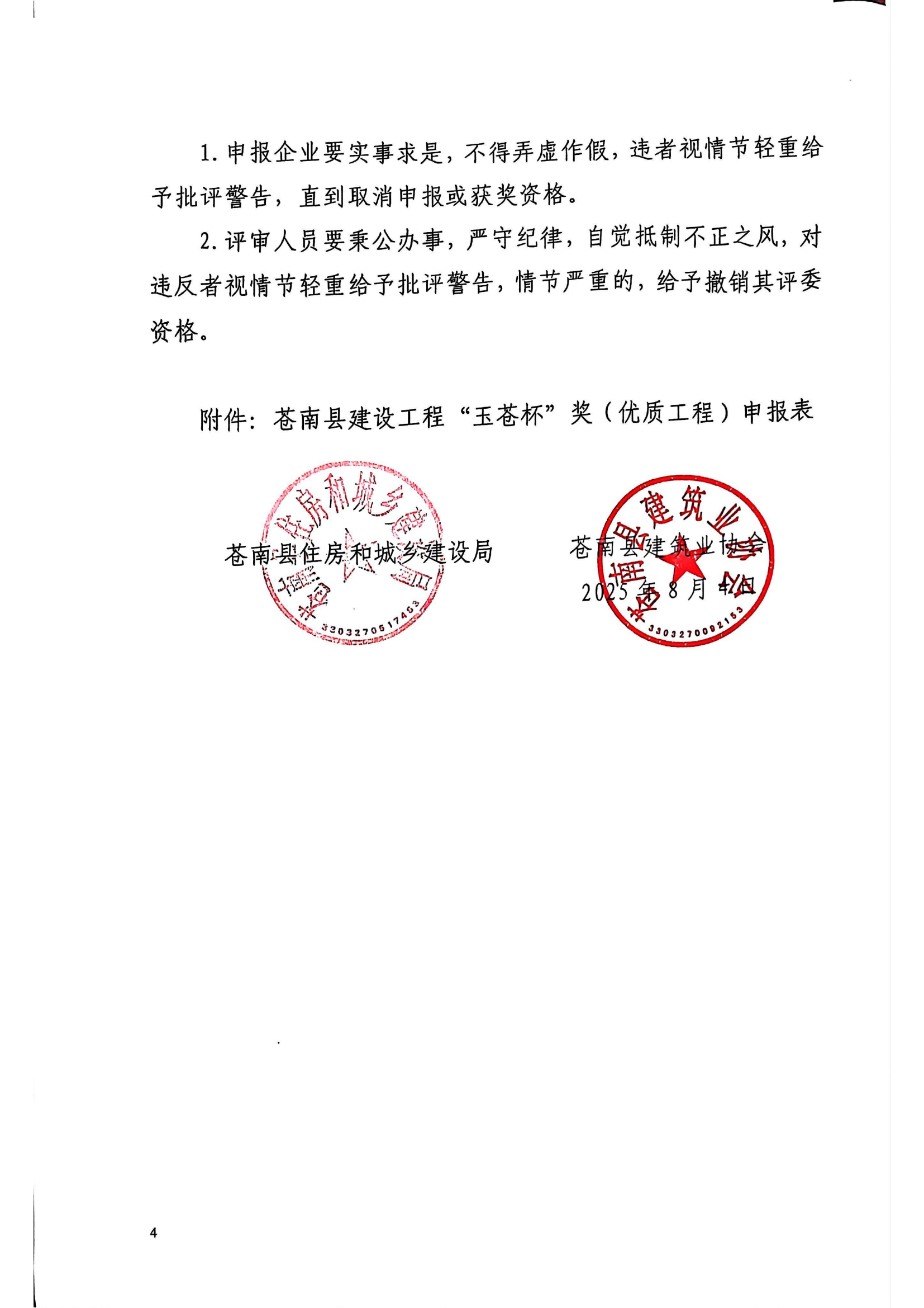 关于开展2025年度苍南县建设工程“玉苍杯”奖(优质工程)评审工作的通知